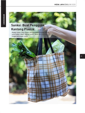 MEDIA JAYA EDISI | 08 2020 LINGKUNGAN Sanksi Buat Pengguna Kantong Plastik Pelaku usaha yang masih menggunakan kantong plastik sekali pakai bakal dikenai sanksi. Mulai dari teguran hingga penutupan usaha. 27